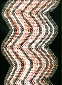 Montar 201 pontos em cinza e tecer 2 carreiras. Mudar para o cor de rosa e tecer mais 2 carreiras. Repetir esta seqüência alternando as cores de forma seqüencial ou aleatória.