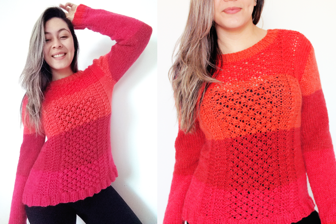 Fazer igual nas frentes (usei um novo segundo novelo), porém, tecer a peça apenas em ponto de malha (sem nenhum ponto decorativo).